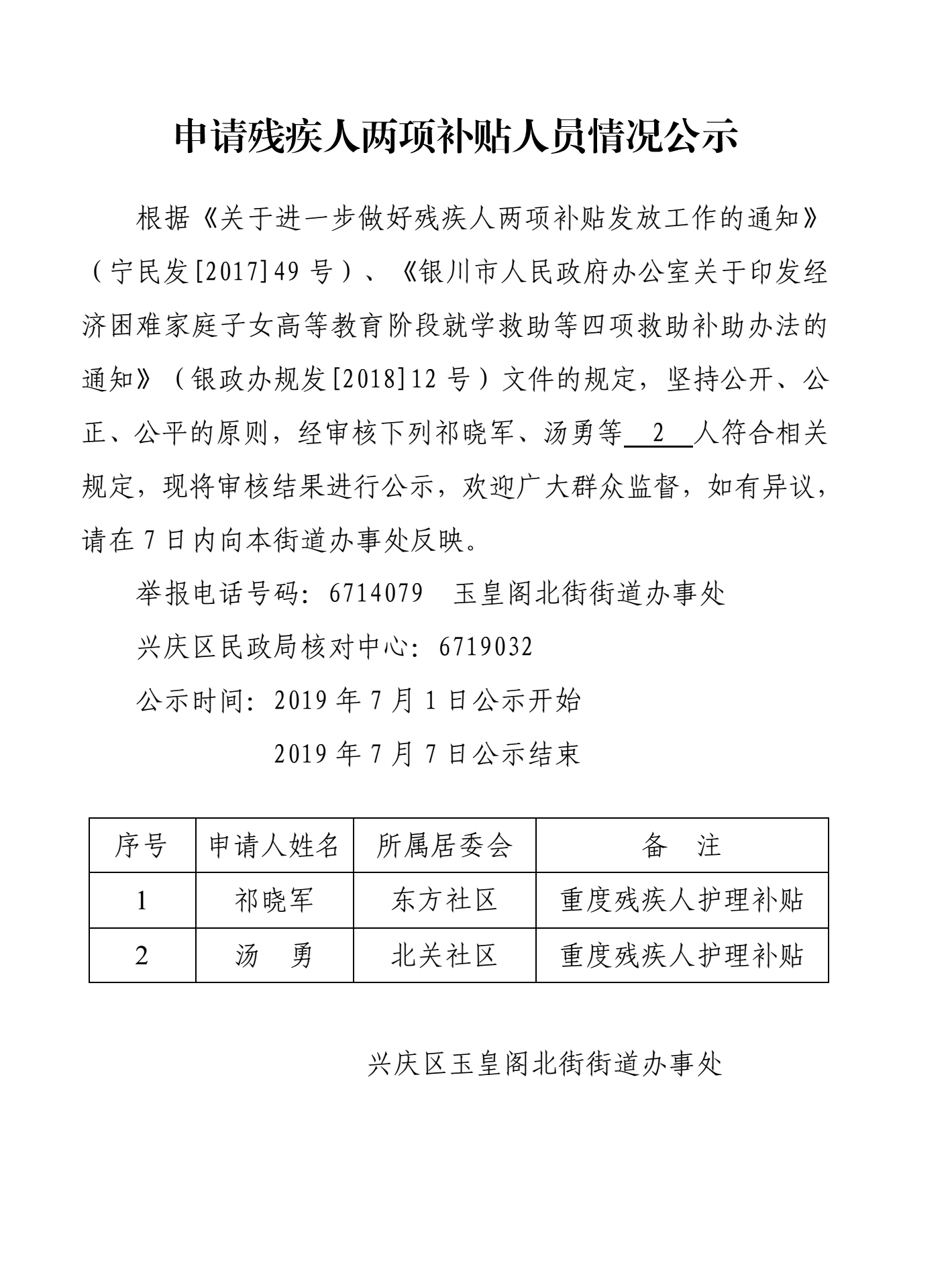 兴庆区玉皇阁北街7月申请残疾人两项补贴人员情况公示